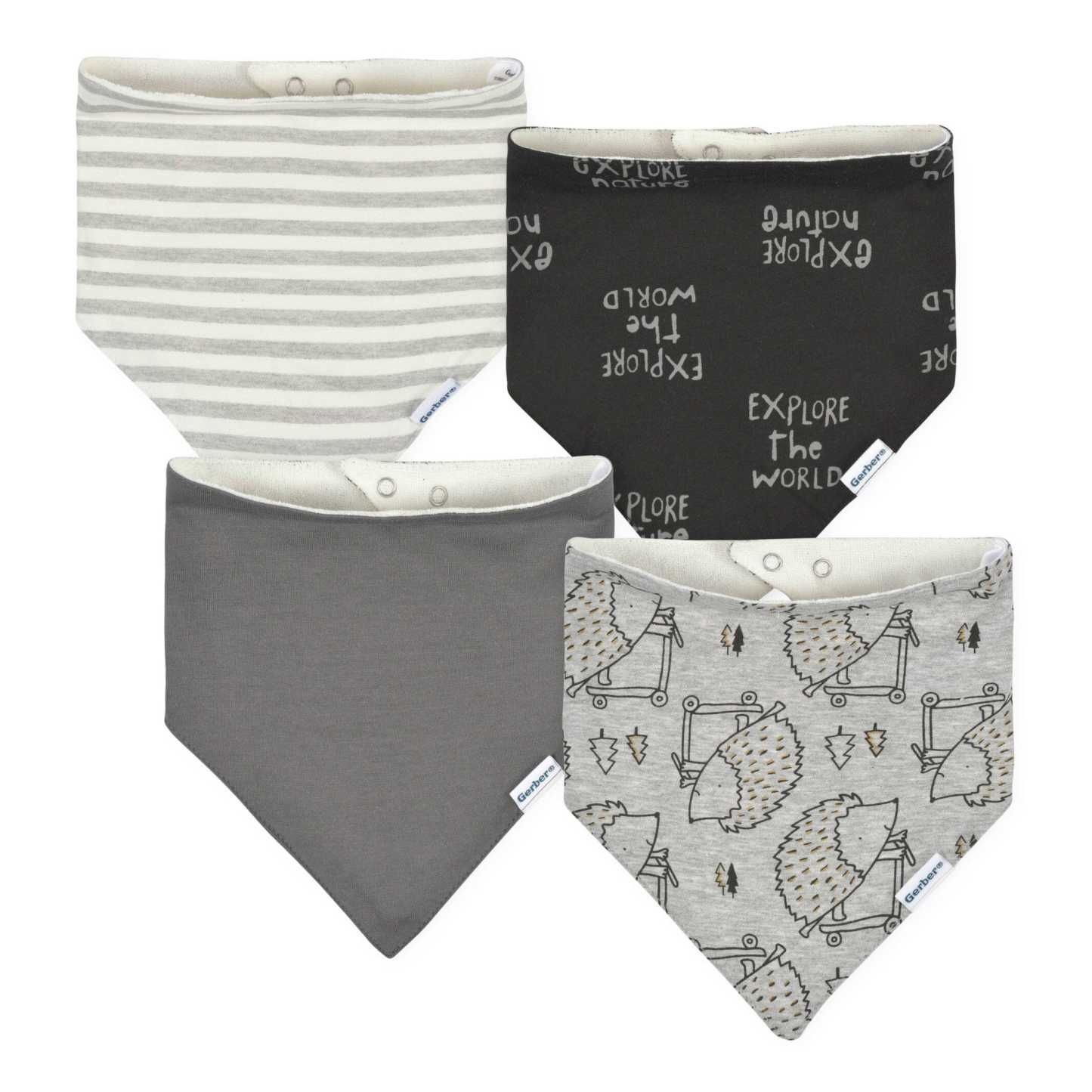Our adorable baby bandana bibs are essential for teething babies. Keep your little one comfy and clean-faced with our soft, absorbent bibs made with cotton and terry fabrics. We use STANDARD 100 by OEKO-TEX® certification on products tested in an independent laboratory against a list of 400 harmful substances, including PFAS. This pack includes four baby boy bandana bibs in gray and charcoal with hedgehog art.