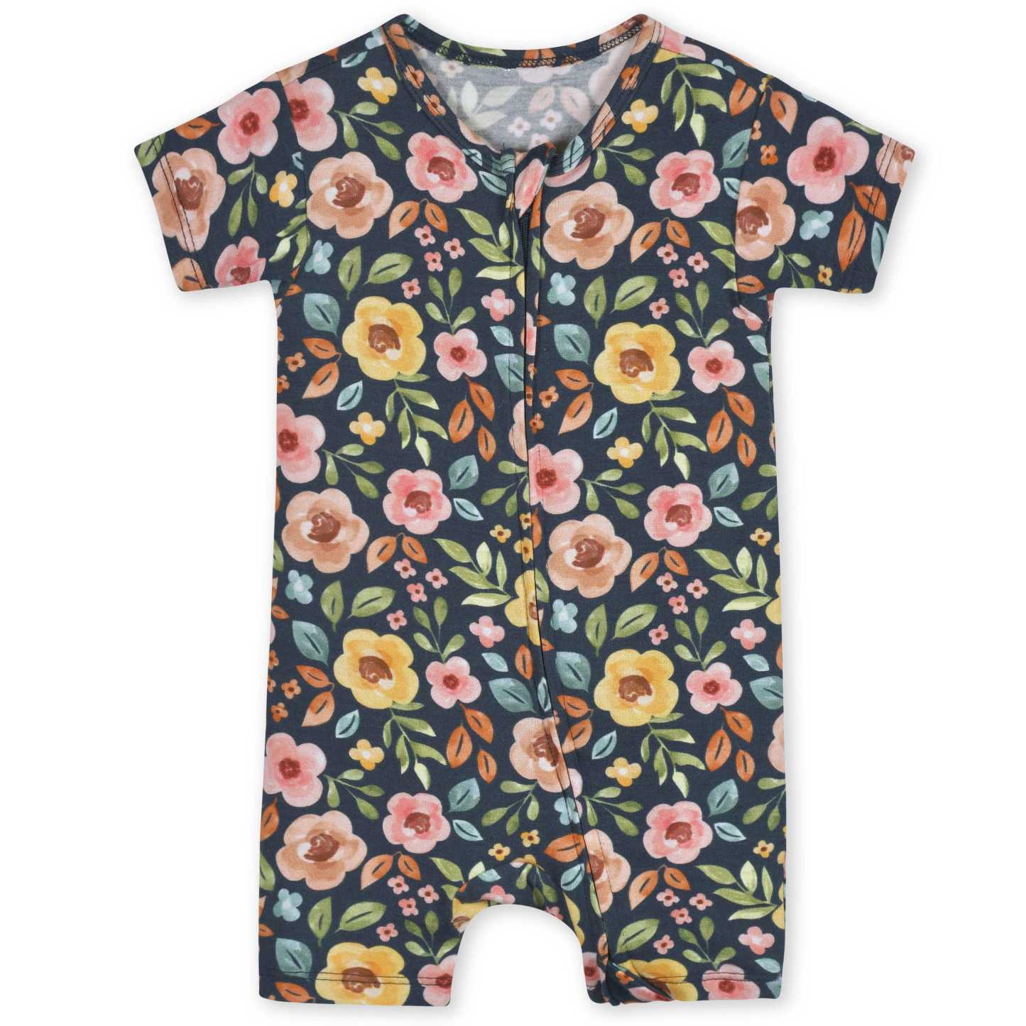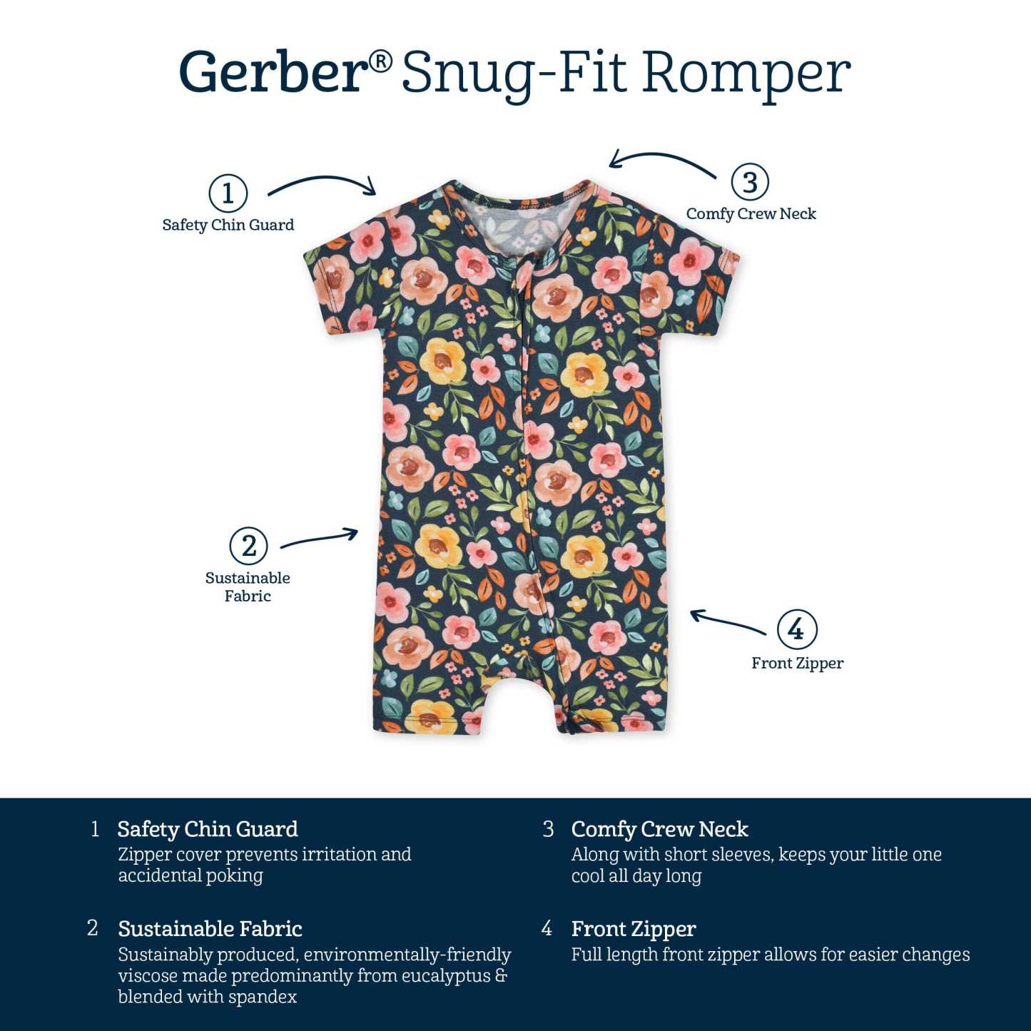 Designed for every season, our buttery soft collection of affordable rompers, sleepwear, Dresses and headbands will be their new wardrobe faves! We've partnered with Livaeco™ by Birla Cellulose to bring you and your little ones a more sustainably produced, environmentally-friendly viscose fiber collection made predominately from eucalyptus blended with spandex. This extremely soft navy floral print romper is perfect for 'round-the-clock wear. High-quality, lightweight, breathable, durable fabric with the perfect amount of stretch for active babies and toddlers. Prints and solids made for sibling matching. This infant short sleeve romper has comfy fitting shorts and a front zipper to make changes easy. Gerber® quality, comfort, safety and value never goes out of style!