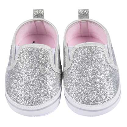 Perfect for more formal events, these shoes are made from 100% cotton canvas with a poly-jersey lined interior for a comfortable fit and no-skid soles. Whatever the occasion, your baby girl will shine in these silver sparkle baby shoes. Pack includes one pair of slip-on shoes.