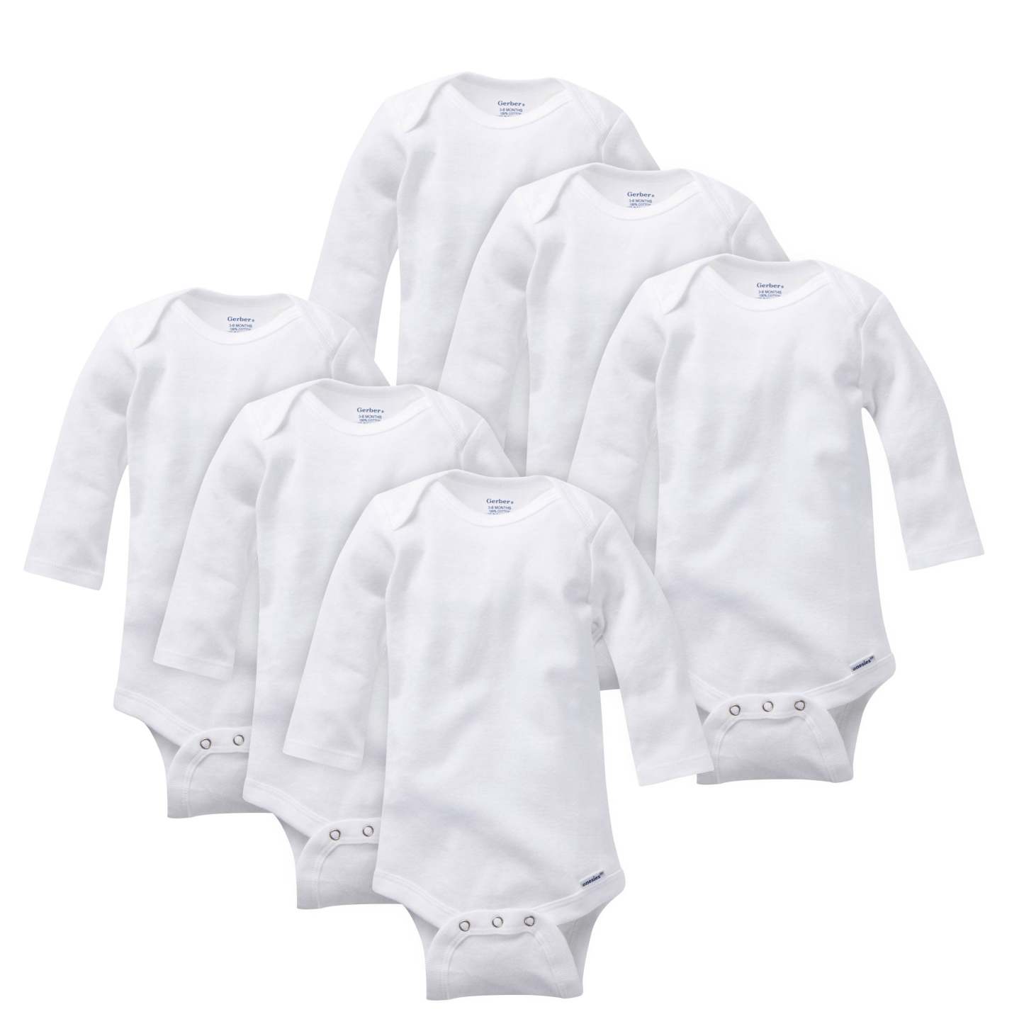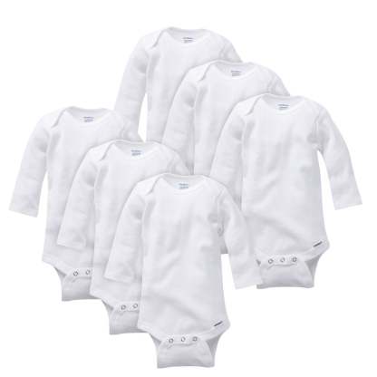 This 6-pack of baby boy or girl unisex long sleeve Onesies® bodysuits is a favorite of parents of little ones. The neutral white pairs with everything in your little one's wardrobe to provide plenty of flexibility in Dressing. They match with any color or style of bottom to create a low-key outfit for daily wear. When the air turns cooler, they double as a cozy underlayer. Made with 100% cotton rib, the breathable fabric keeps delicate skin comfy and dry. Handy time-saving features like the higher-in-the-front bottom snap closure make quick work of diaper changes. Machine wash and dry fabric requires no added effort on laundry day.