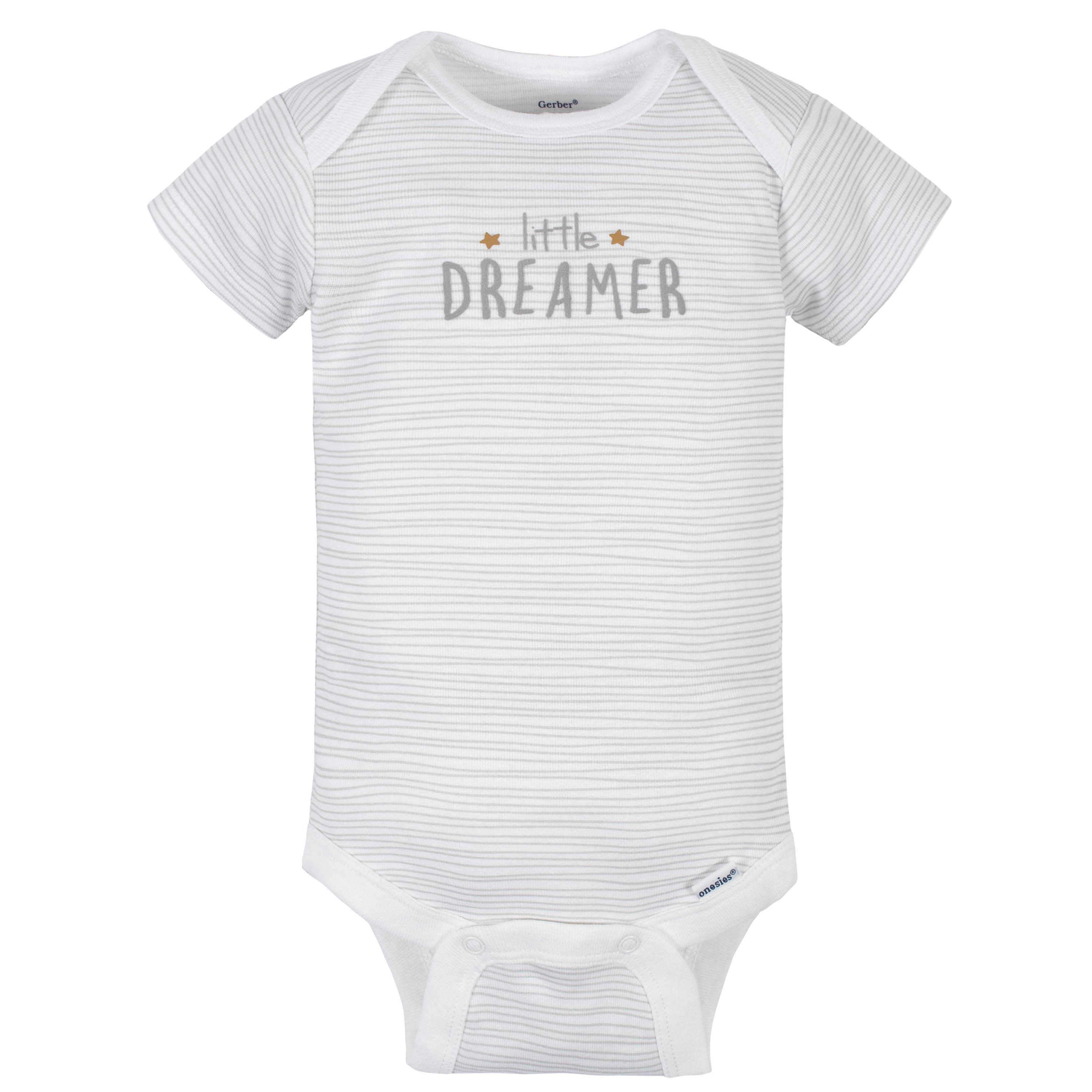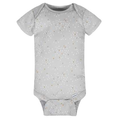 Baby Onesies® bodysuits are essential for baby! These adorable, assorted Onesies® bodysuits are made with a soft cotton fabric that’s perfectly comfortable against baby’s delicate skin. Baby will love how breathable this material is! We had this product independently certified with STANDARD 100 by OEKO-TEX® so that you don’t have to worry about harmful substances in your baby’s clothing. This pack includes four bodysuits. These classic baby clothes feature lap shoulder necklines that make wardrobe changes easier than ever. The necklines allow the garment to slip over baby’s head in total comfort. They also feature bottom snap enclosures that are conveniently positioned higher in front to quicken diaper changes. Gerber® Onesies® bodysuits are machine washable and machine dryable. Gerber® offers quality products that parents trust to bring their babies style and comfort.